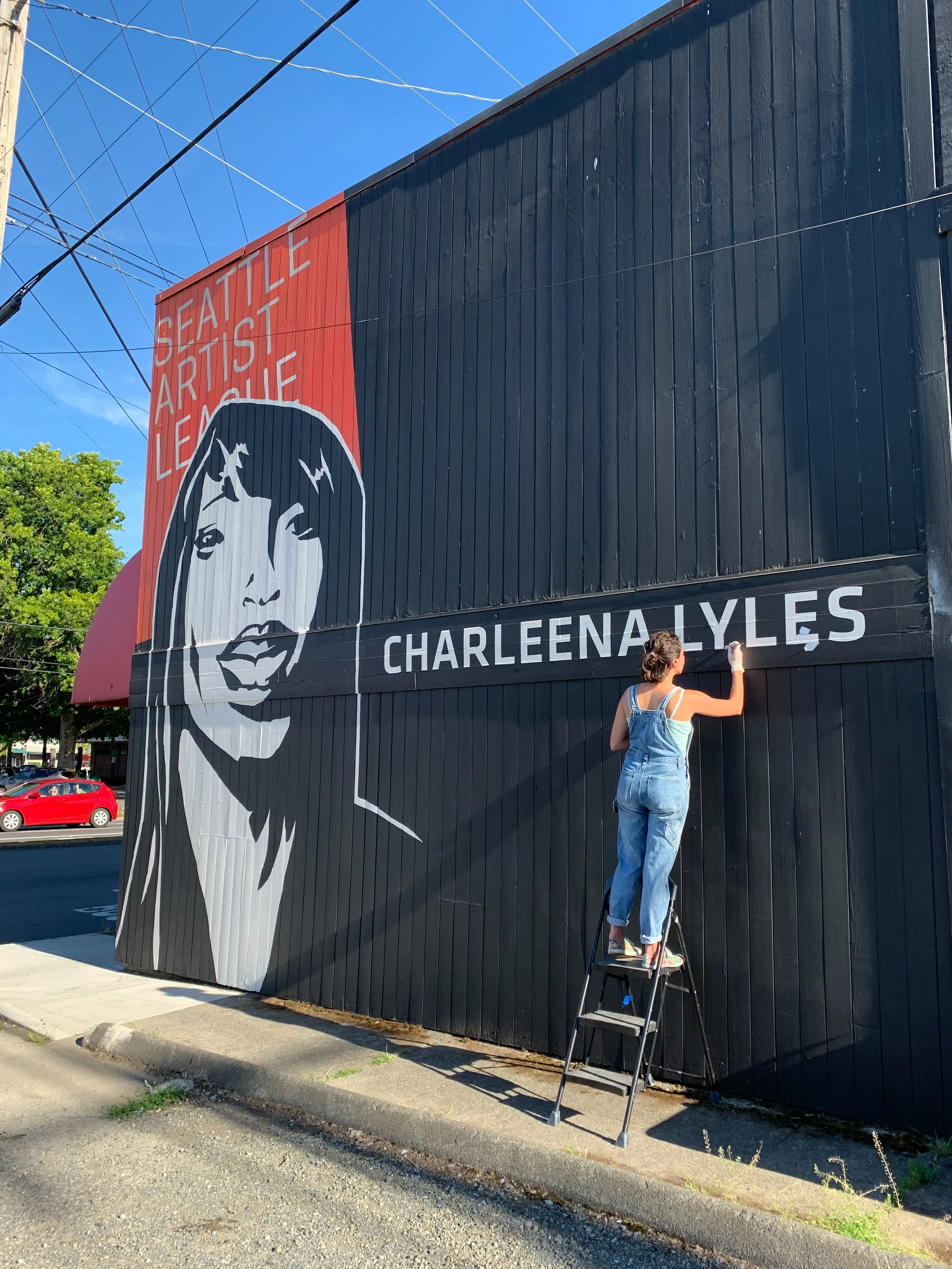 In-progress image of ‘Charleena Lyles’ mural on Aurora, 2020